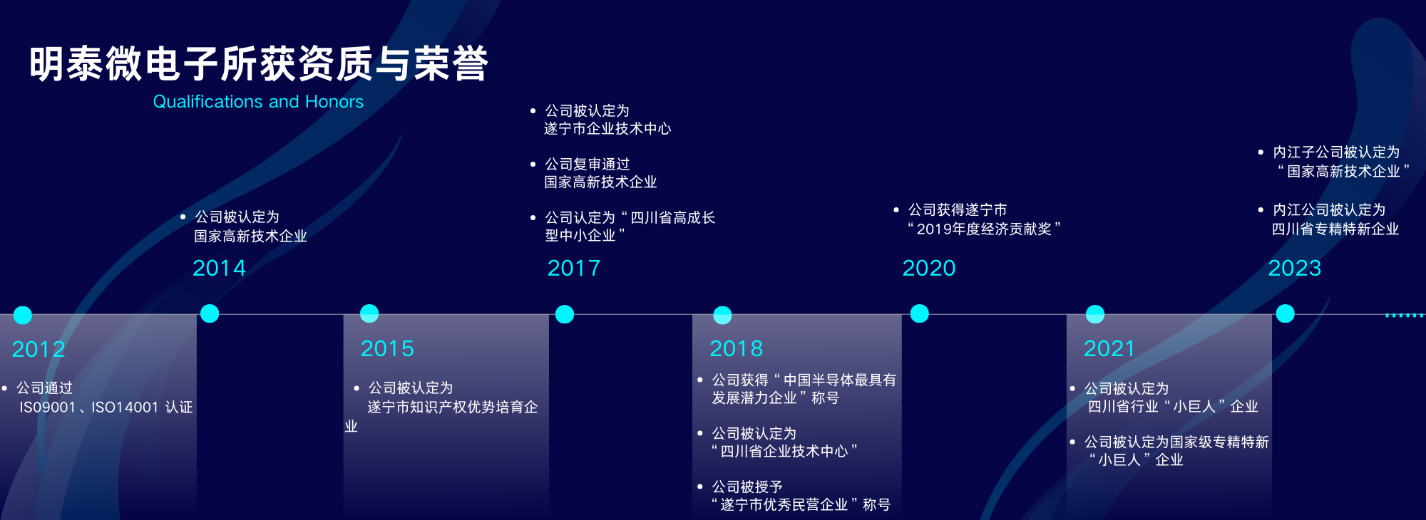 四川明泰電子科技有限公司獲得的資質(zhì)和榮譽(yù) ?2012年,公司通過ISO9001和ISO14001認(rèn)證; 2014年,公司認(rèn)定為“國家高新技術(shù)企業(yè)”; 2015年,公司認(rèn)定為“遂寧市知識(shí)產(chǎn)權(quán)優(yōu)勢(shì)培育企業(yè)”;
